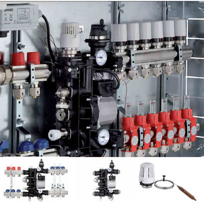 混水中心有兩(liǎng)個核心部件:一個是用于提供散熱後(hòu)低溫回水與高溫進(jìn)水混合的動力裝置――循環泵;另外一個是用戶控制高溫進(jìn)水與低溫回水混合比例以維持混合水溫度穩定的混水部件――溫控裝置。高溫采暖供水從上面(miàn)進(jìn)入系統,與經(jīng)過(guò)地暖盤管降溫後(hòu)的較低溫度的地暖回水在混水部件中進(jìn)行混合;混合出合适溫度的水再次進(jìn)入分水器,然後(hòu)通過(guò)地暖盤管散熱采暖;循環泵用于提供混合水的動力。混水部件具備控制混合水溫度在設定值的功能(néng),避免随著(zhe)供水溫度變化混水溫度也不穩定,達到自動恒溫的效果。